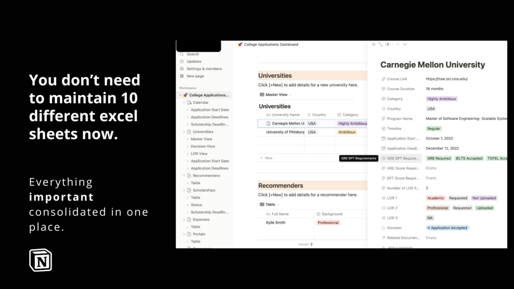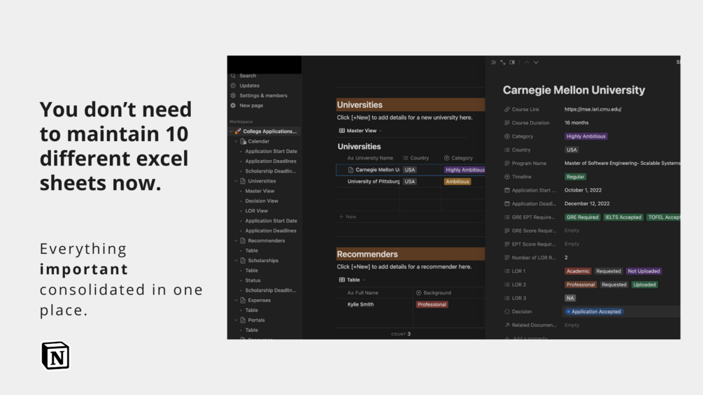 Are you ready to embark on the journey of a lifetime and pursue your dream college education? Believe me I have gone through this and I understand how the college application process can be overwhelming and chaotic, with countless deadlines, tasks, and information to manage. But fear not! This Notion Template is a game-changing solution that will streamline your entire college application experience and empower you to take control of your own college applications.